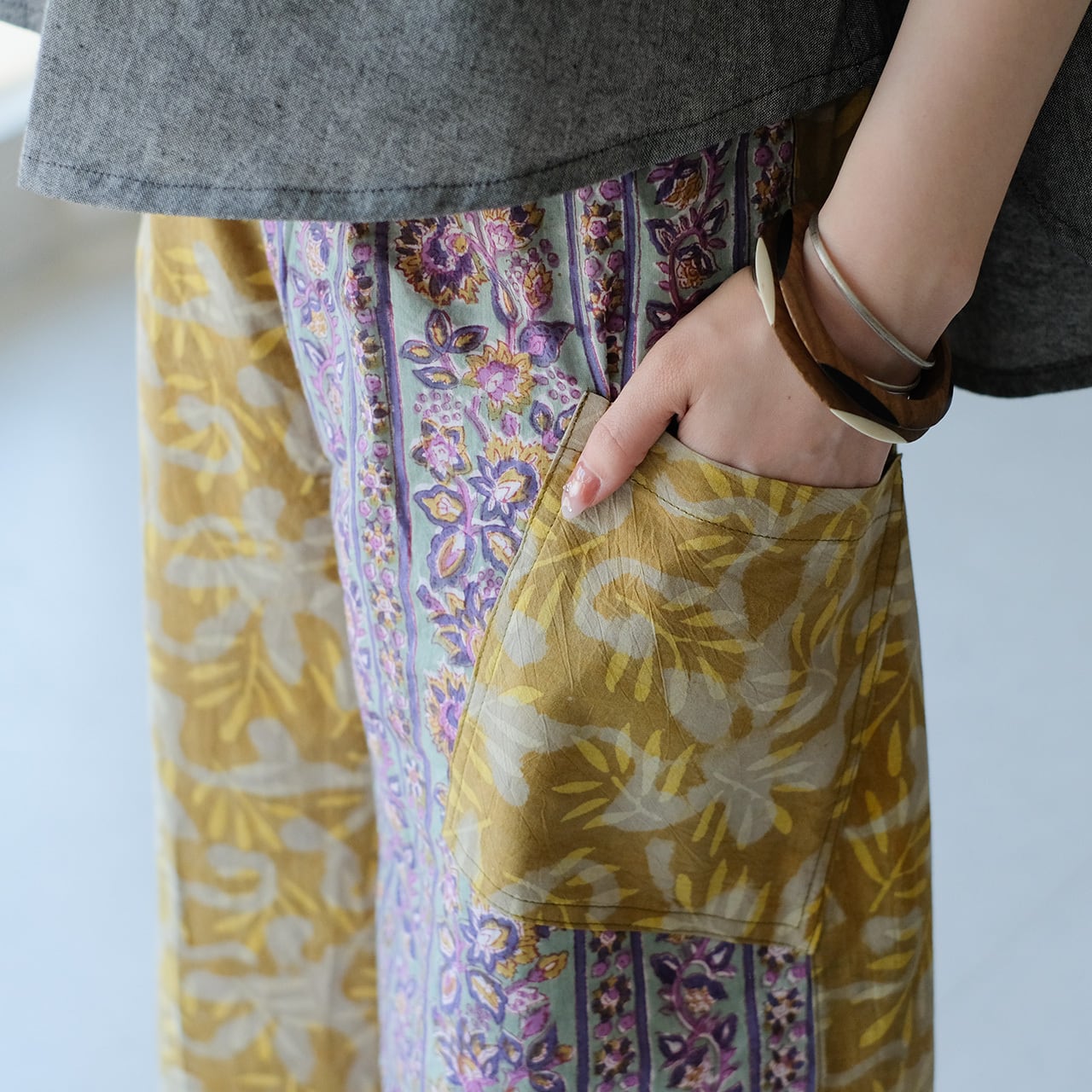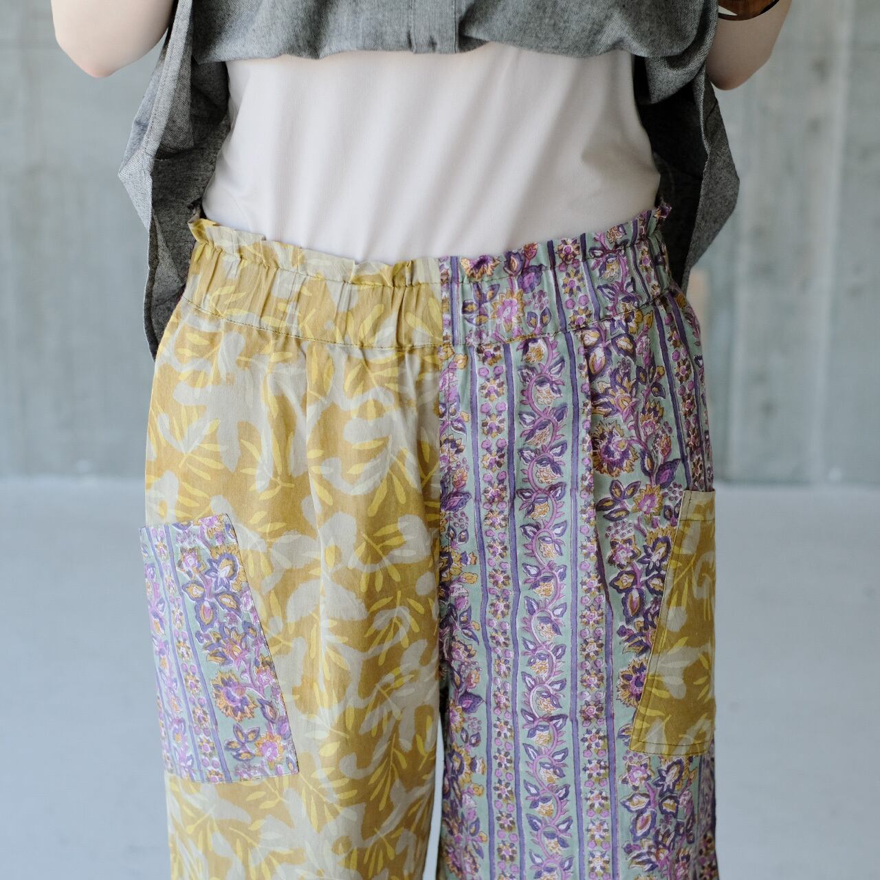 ポケットまで生地違いで仕上げた、こだわりのパッチワークです。
