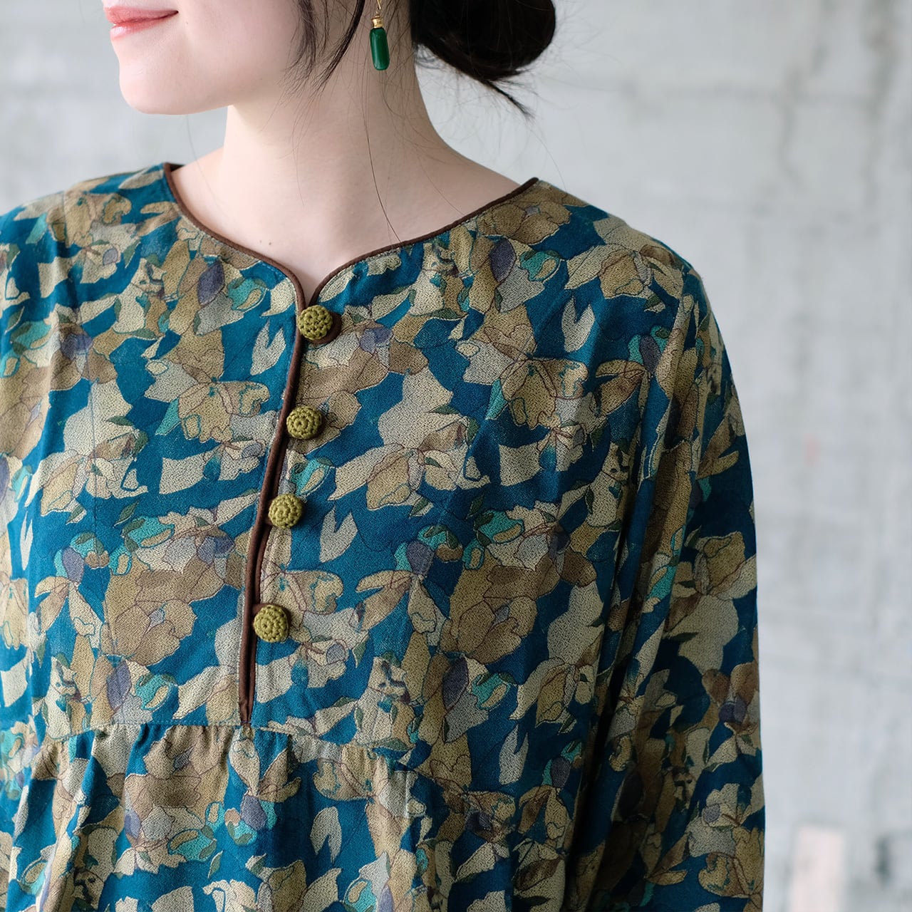 魅せる一枚!くるみボタンのフレアブラウス(25w-01)ブルー