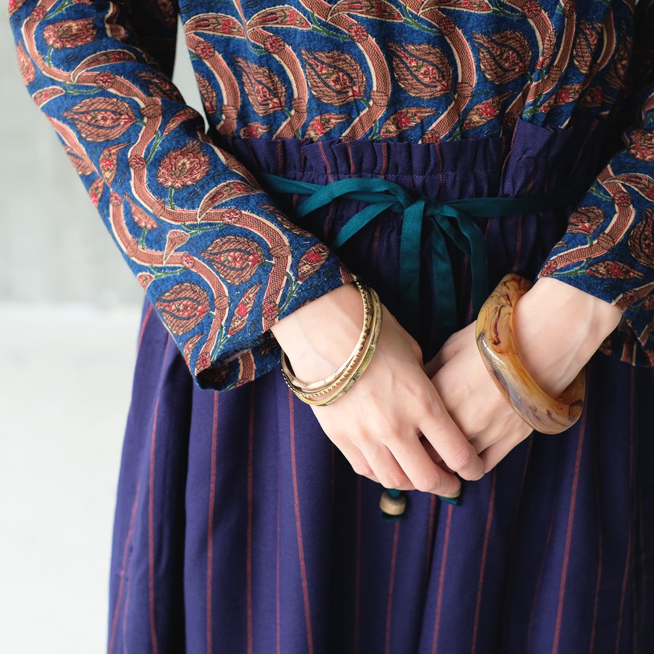 彩度高めかつ深い色味のスカートを組み合わせたドッキングワンピース。