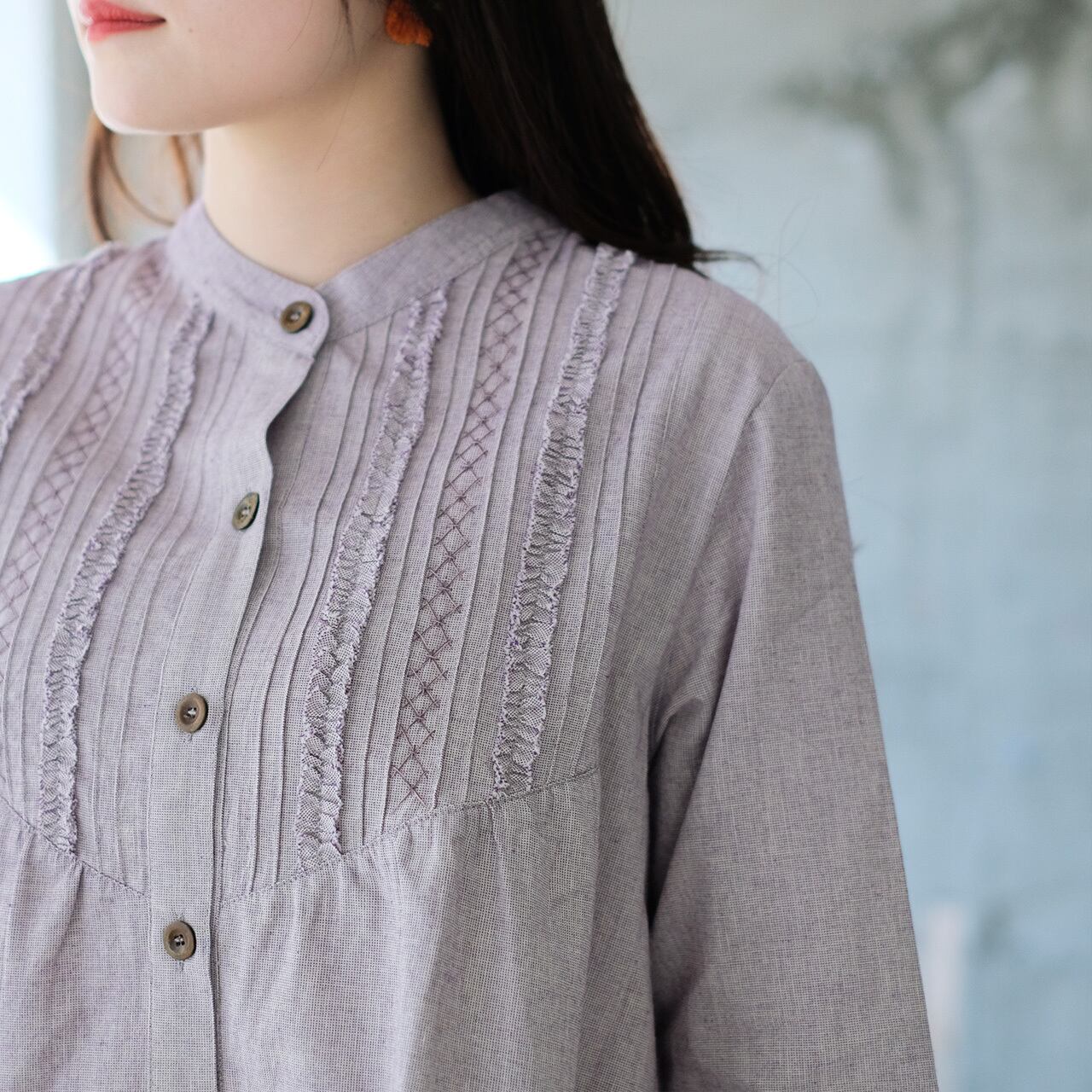 縦に入ったピンタックの合間に、手刺繍とフリルが施されています。
