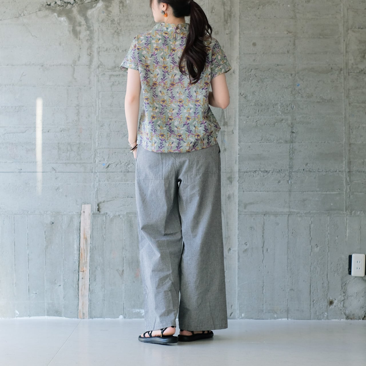 幅ゆったりめのストレートパンツで、どんなトップスとも合わせやすいシルエット。