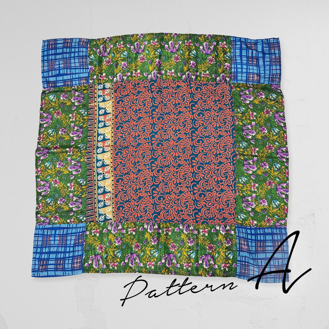 別のサリー生地と合わせてパッチワークし、正方形に仕上げました。