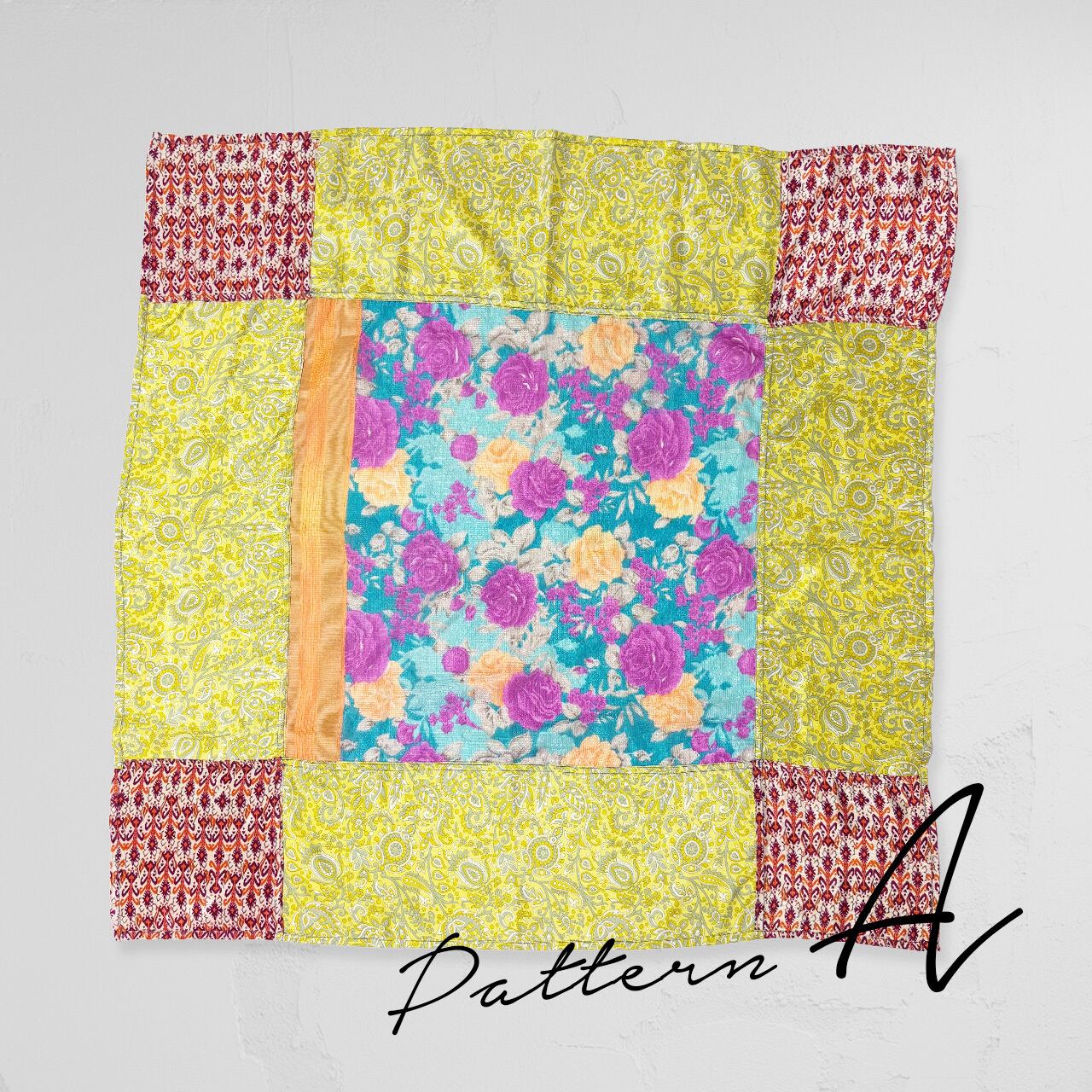 別のサリー生地と合わせてパッチワークし、正方形に仕上げました。