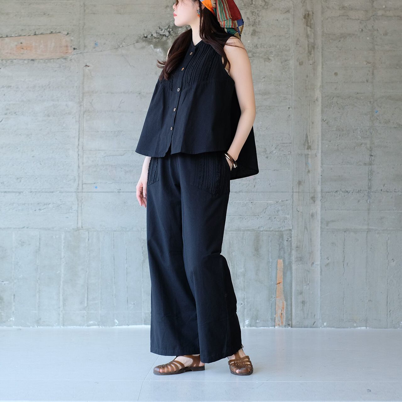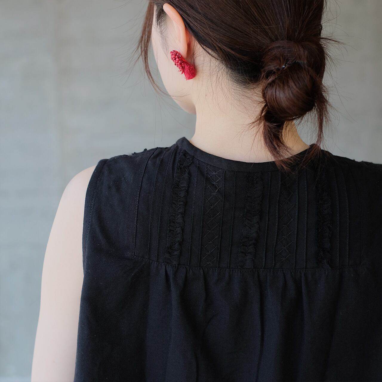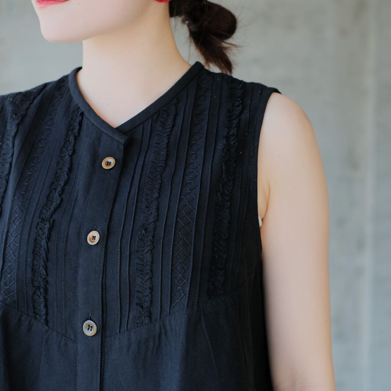 繊細なピンタックとフリルが、顔まわりを華やかに引き立てるノースリーブ。