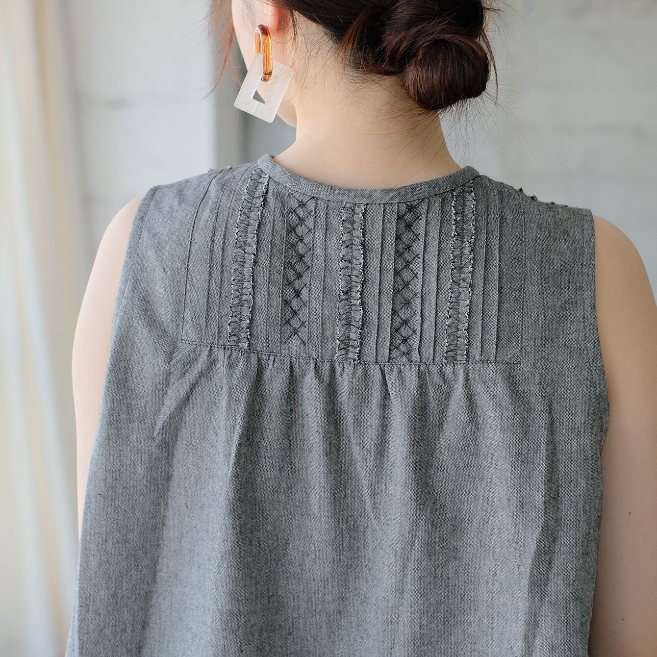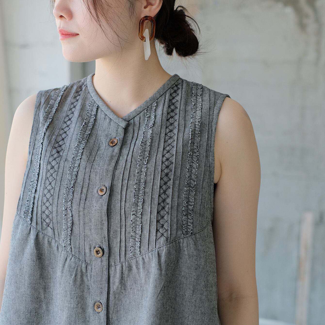 繊細なピンタックとフリルが、顔まわりを華やかに引き立てるノースリーブ。