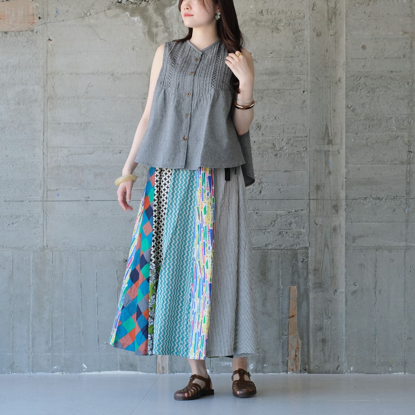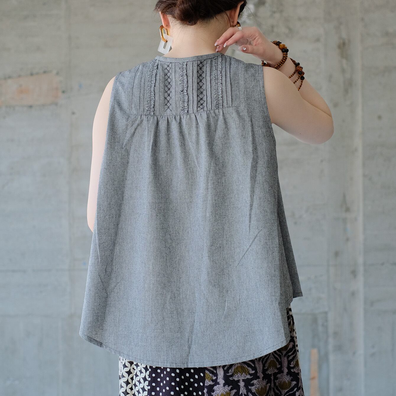 ベストとして重ね着OK!ピンタックフリルノースリーブブラウス(26s-02)グレー