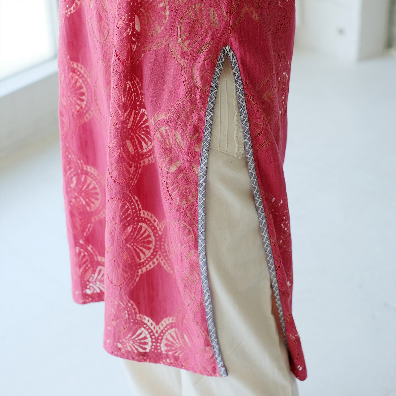 襟ぐりや袖、スリット部分には、ハンドステッチを施し、さりげないアクセントに。