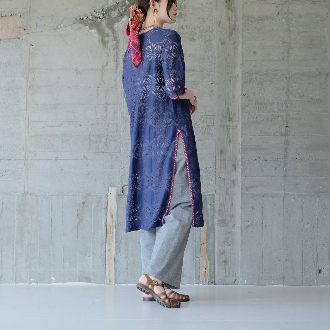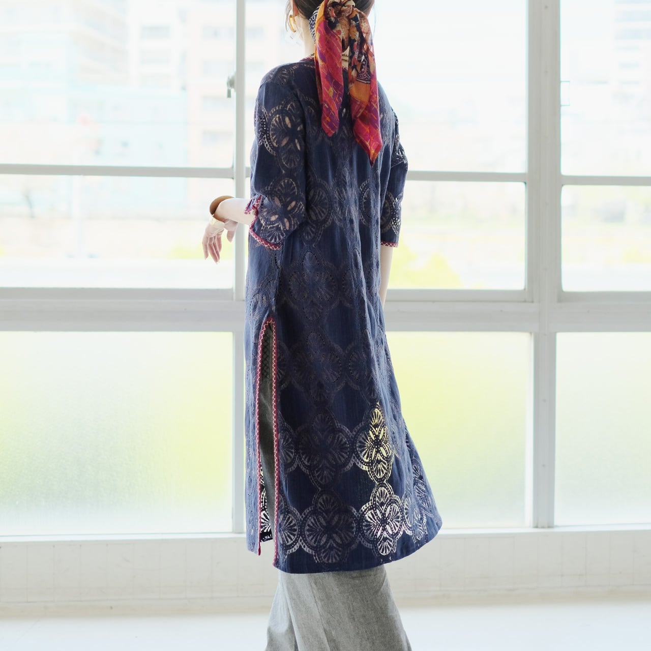 襟ぐりや袖、スリット部分には、ハンドステッチを施し、さりげないアクセントに。