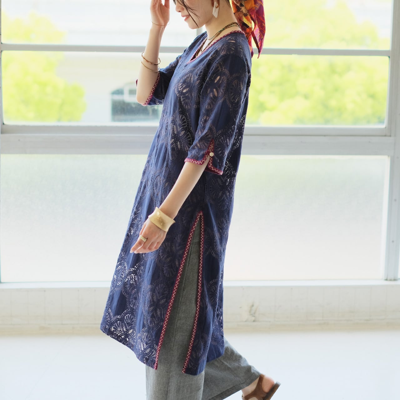 繊細なレースとヴィンテージ感のある柄が魅力の一着。