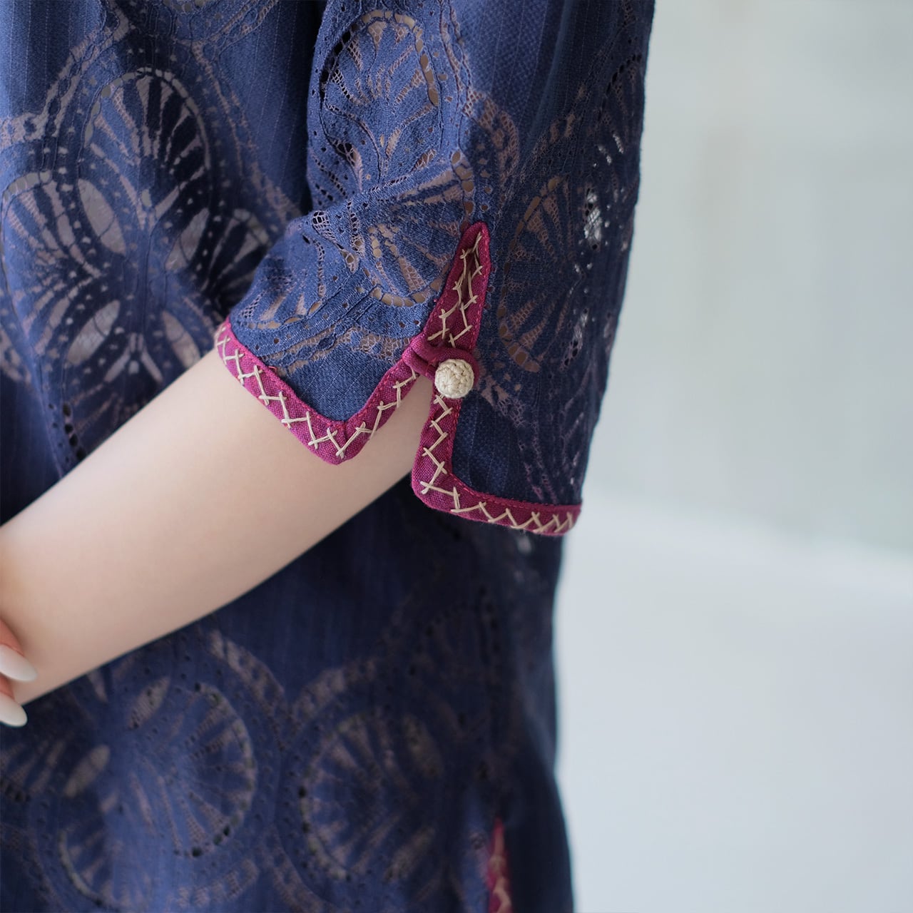 七分袖の袖先には、コロンと小さい包みボタンをつけています。
