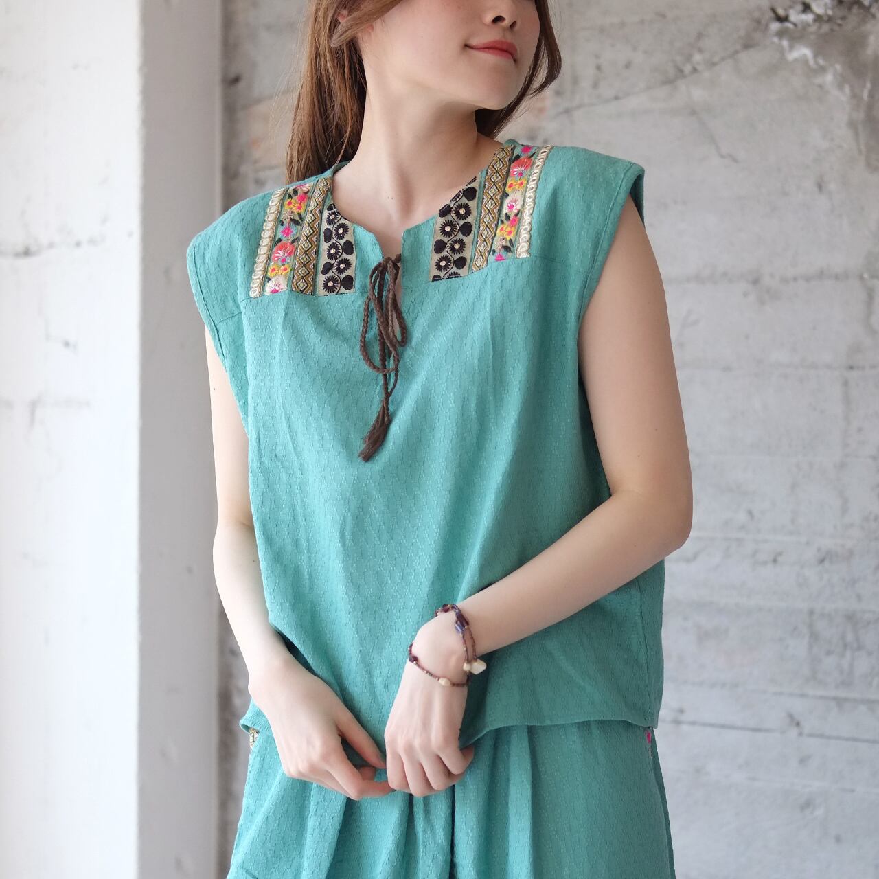 ノースリーブより着やすい”ちょこっと袖”♪インド刺繍バンブーコットントップス(22s-19)ターコイズグリーン