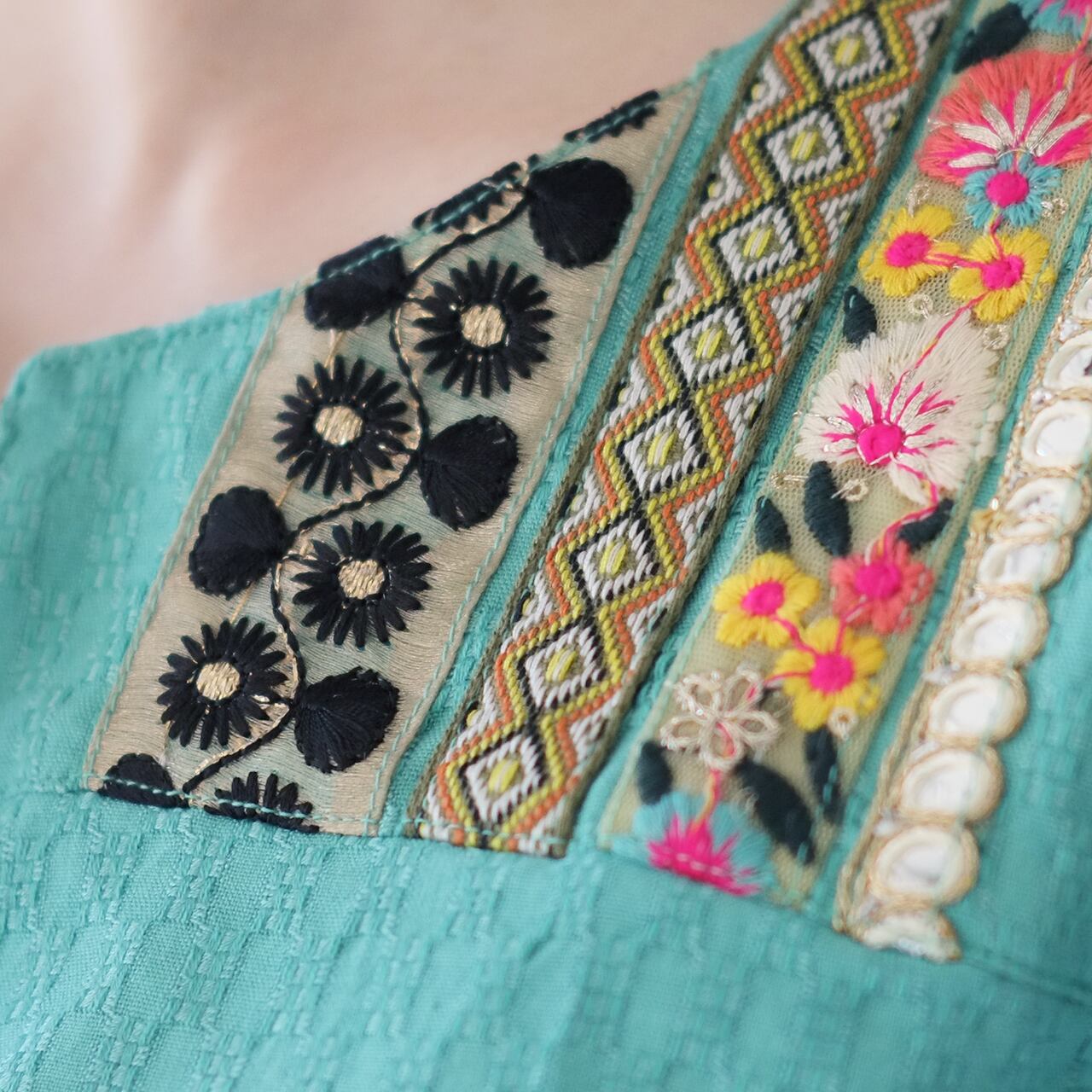 胸元ヨーク部分には、インドの市場で買った刺繍リボンを左右4本ずつ並べています。