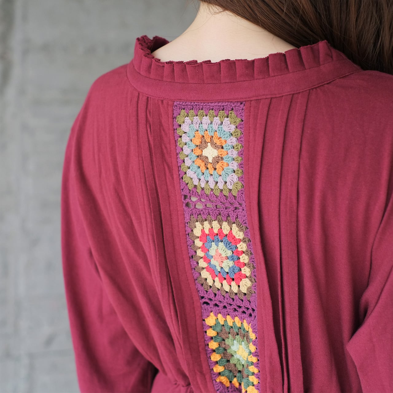 【再販】フラワークロシェ長袖ワンピース(20w-014)ボルドー