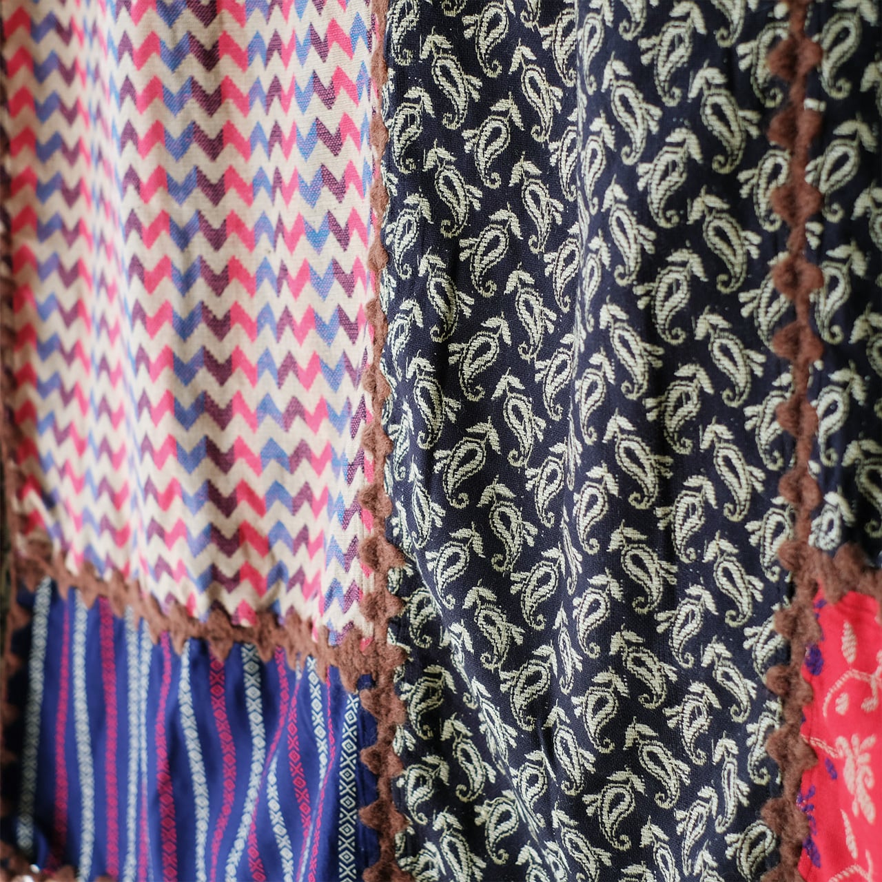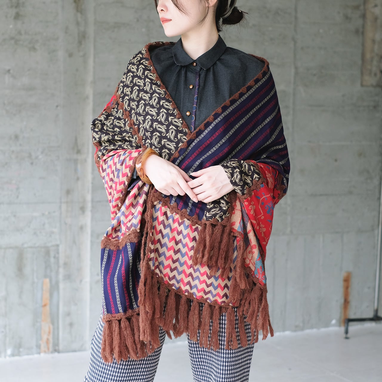 デザイナーが世界を旅して集めた生地を使って、パッチワークした大判ショール。