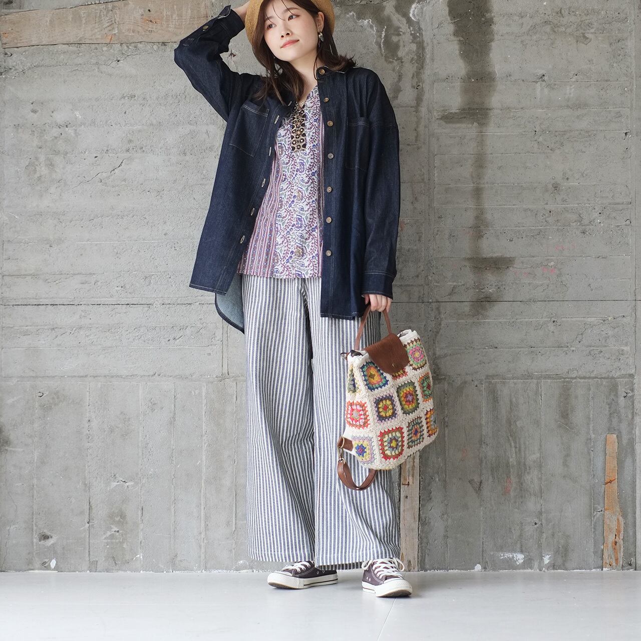 ジーパンのような硬いデニムではなく、トップスにぴったりな優しい素材です。