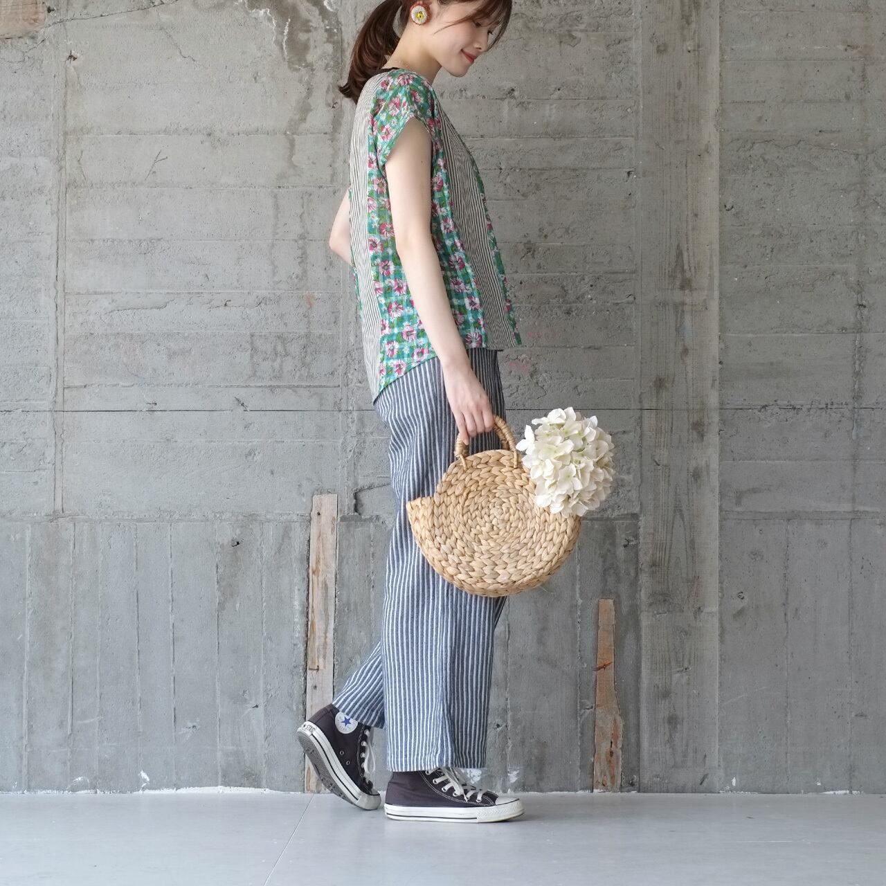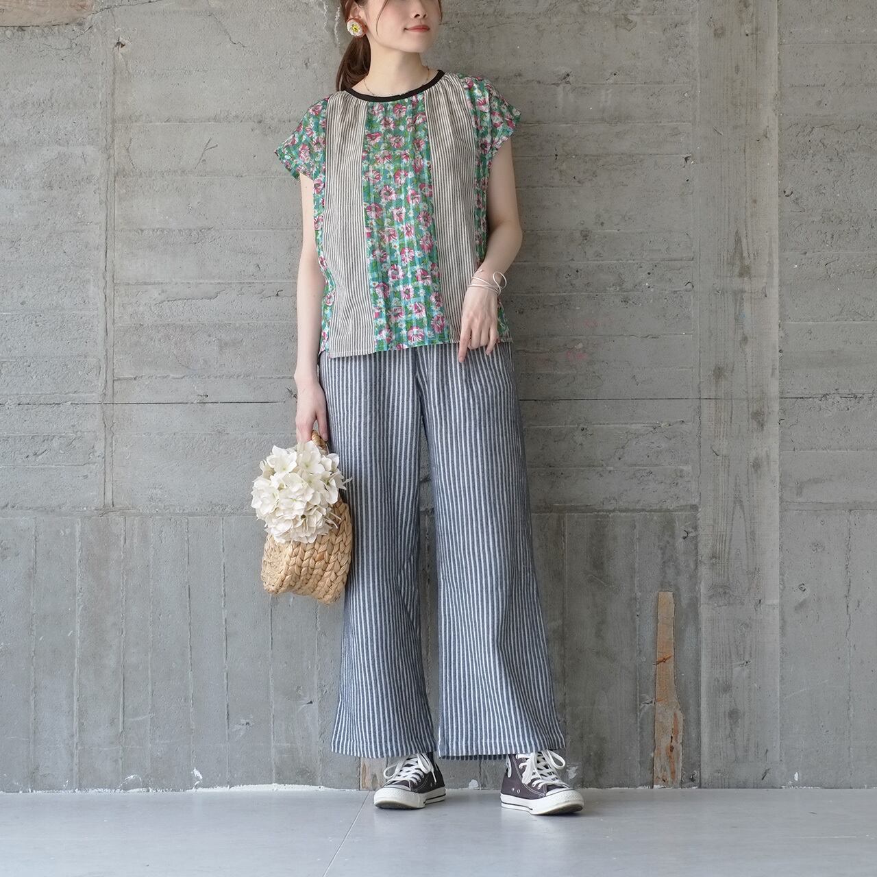 ナチュラルなストライプ柄の生地とパッチワークした半袖トップス。