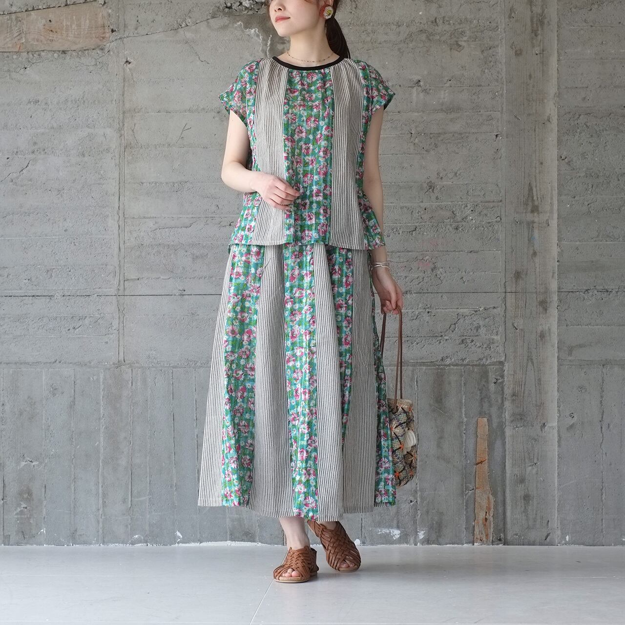 ふんわり涼しげ♪パッチワークフレンチスリーブトップ(23s-14)グリーン