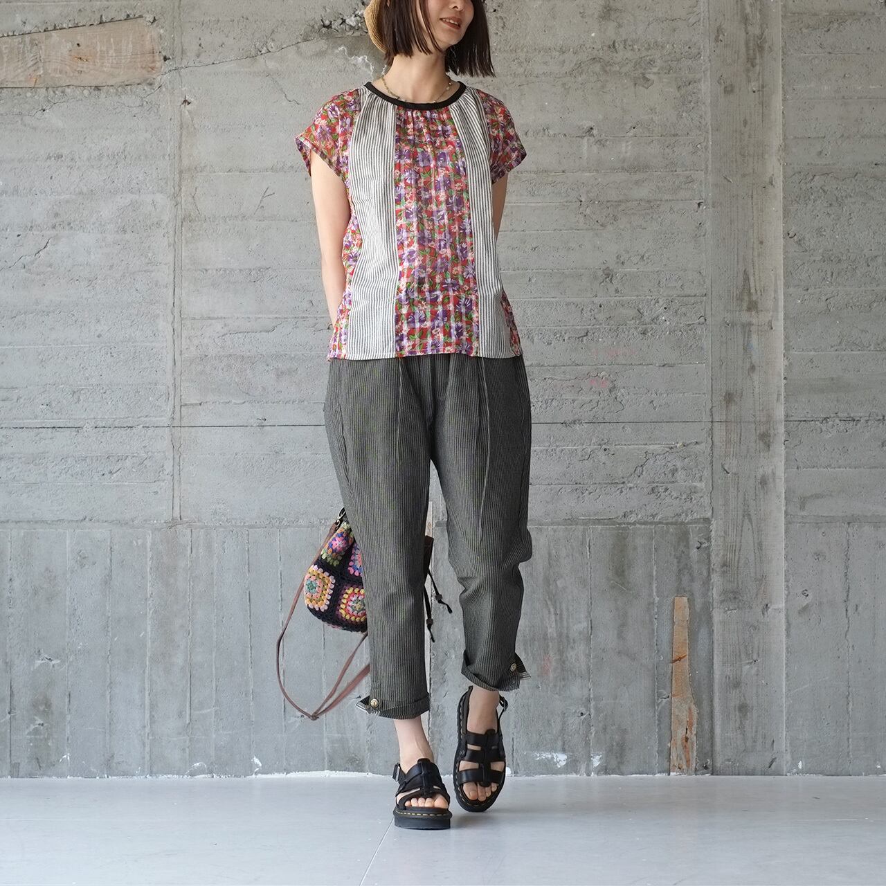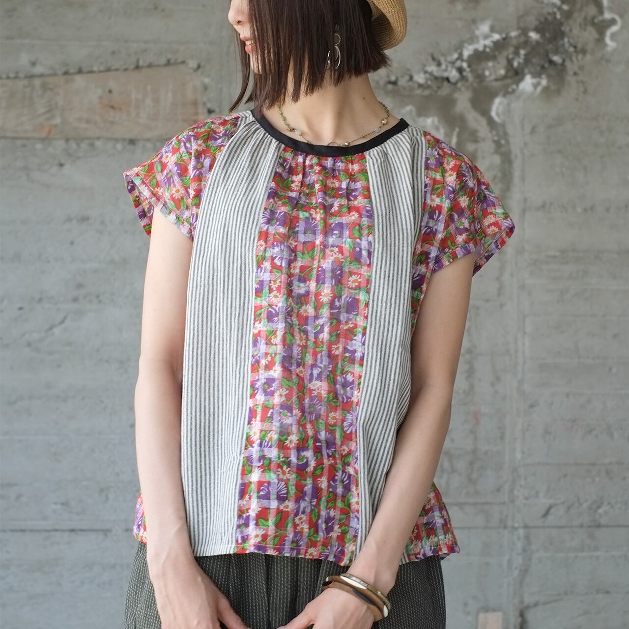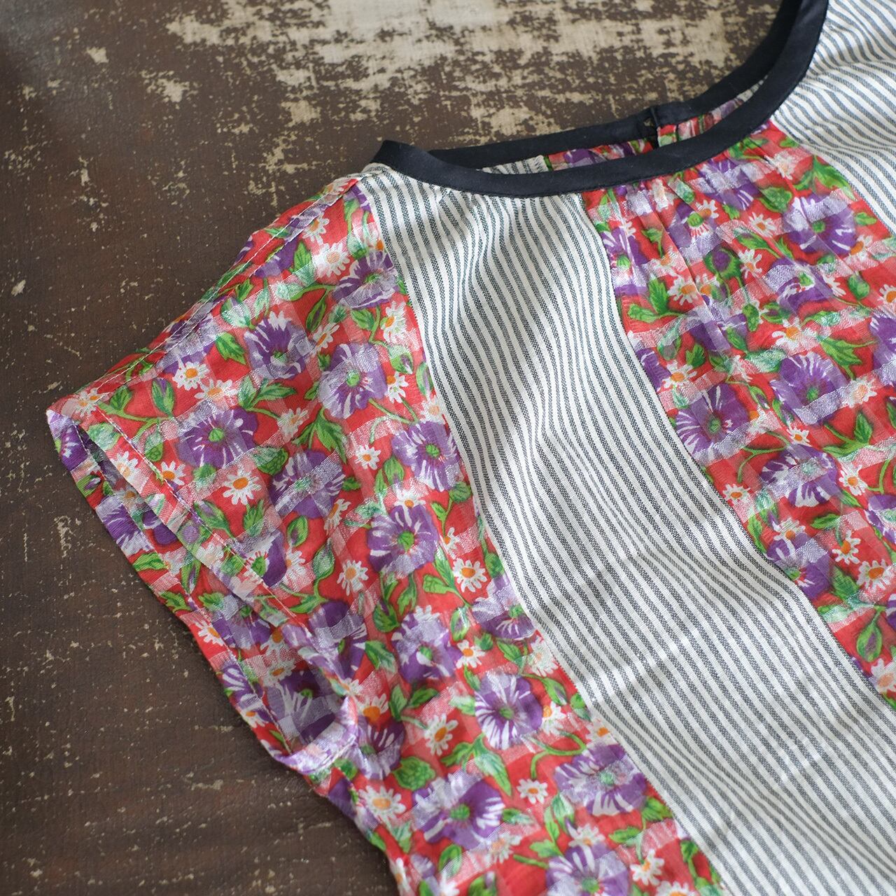 ナチュラルなストライプ柄の生地とパッチワークした半袖トップス。