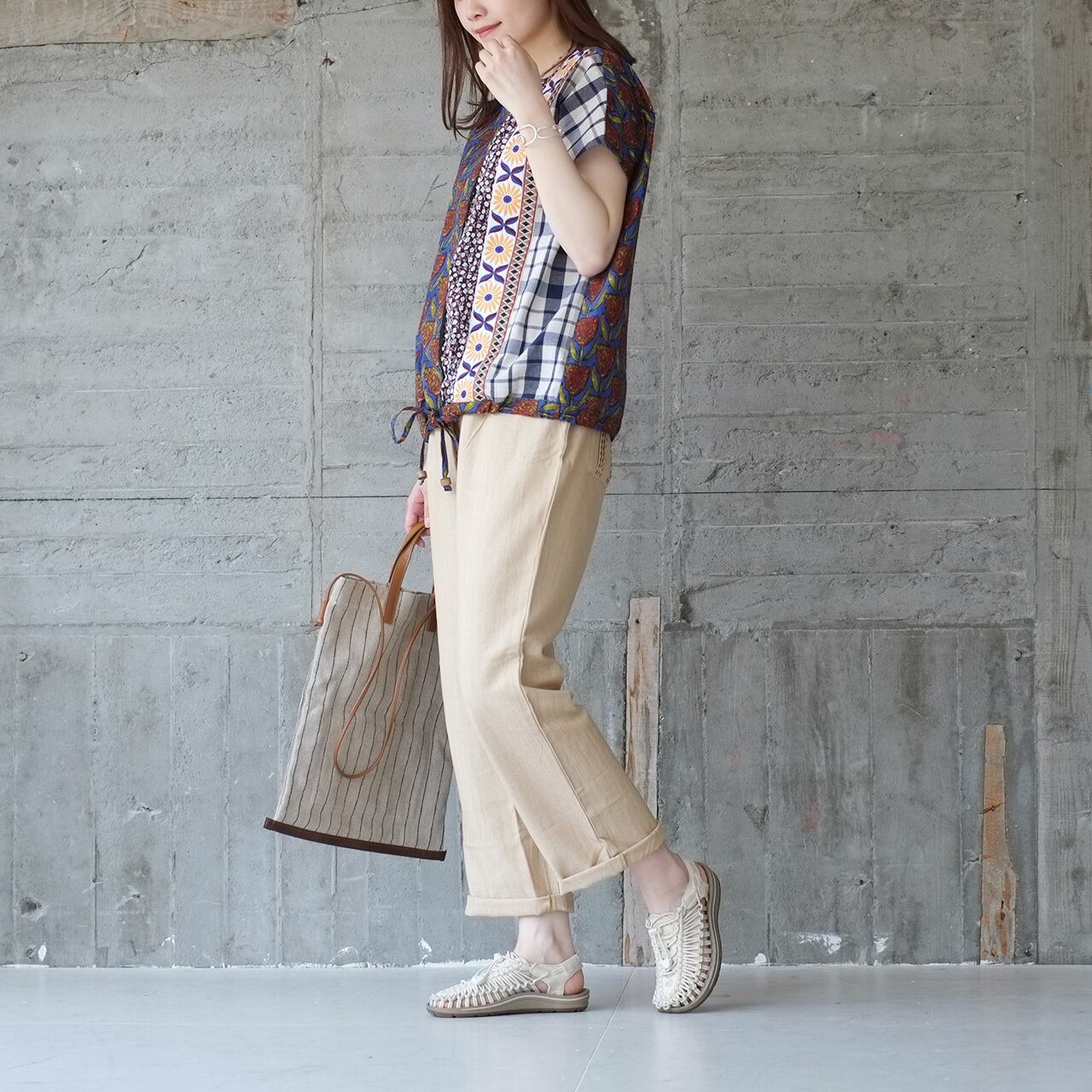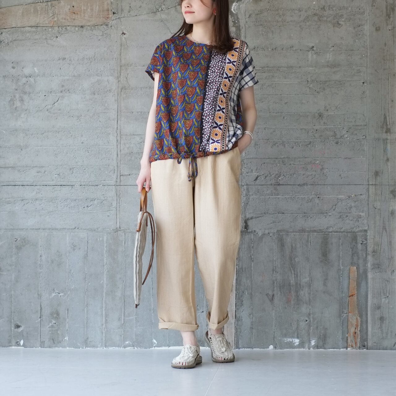 【2025再販】世界を旅するマテリアル♪パッチワーク半袖プルブラウス(23s-13)ブルー