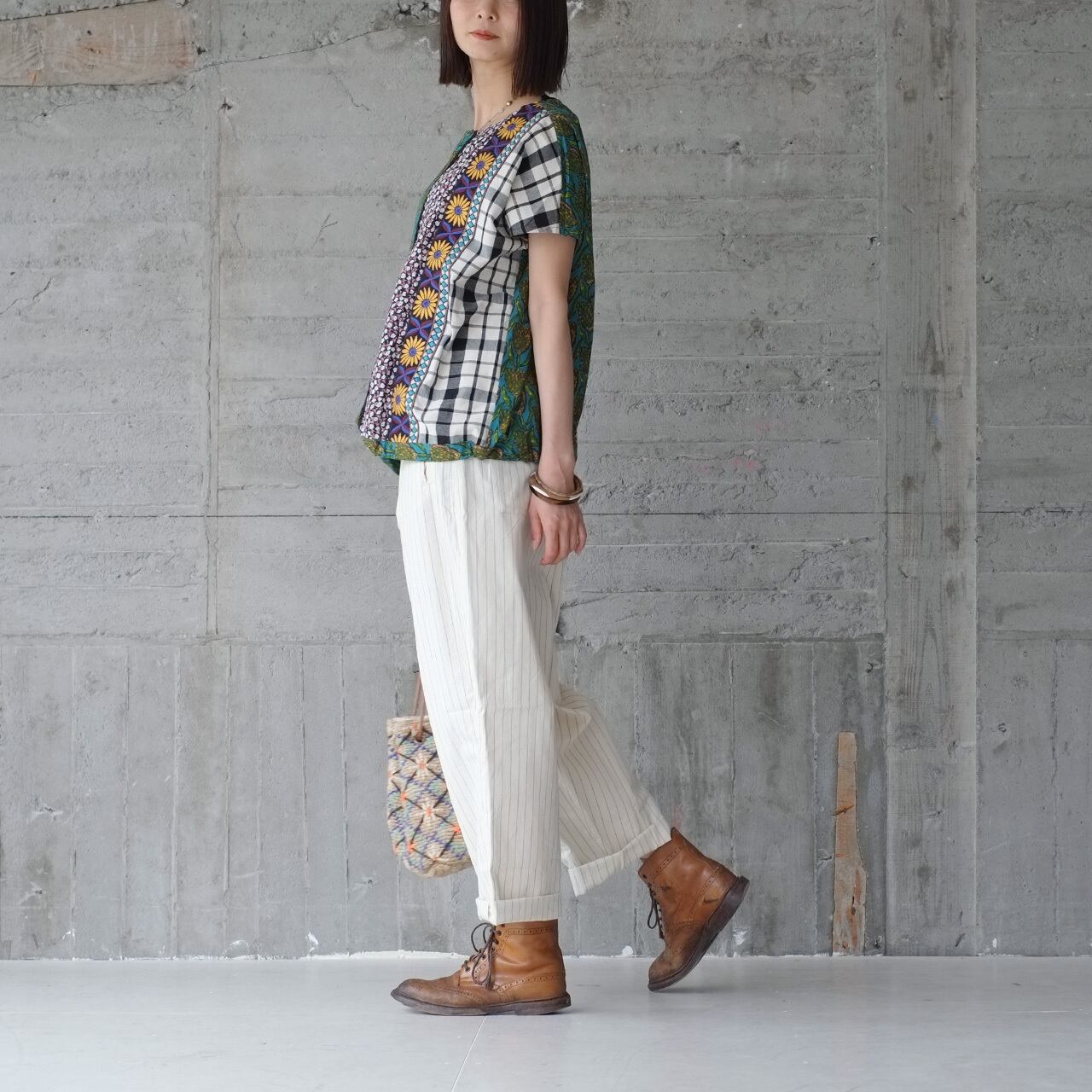 世界中の珍しい生地や素材を、パッチワークで縫い合わせたトップスです。