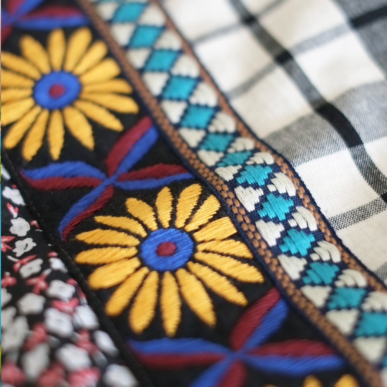 各地で買い付けた生地や素材を少しずつ繋げてお洋服に仕立てました。