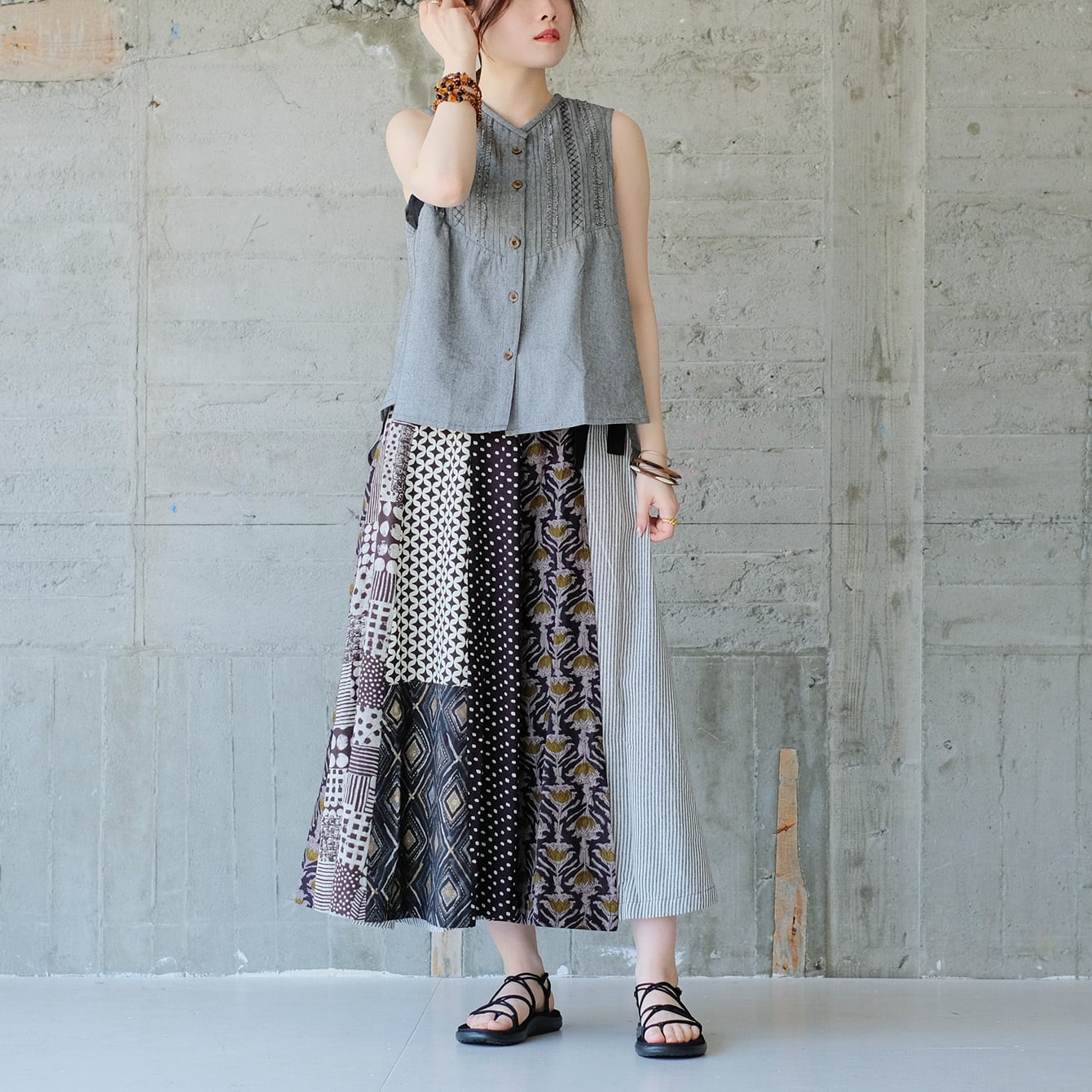 いくつもの生地を組み合わせたカラフルなパッチワークスカート。