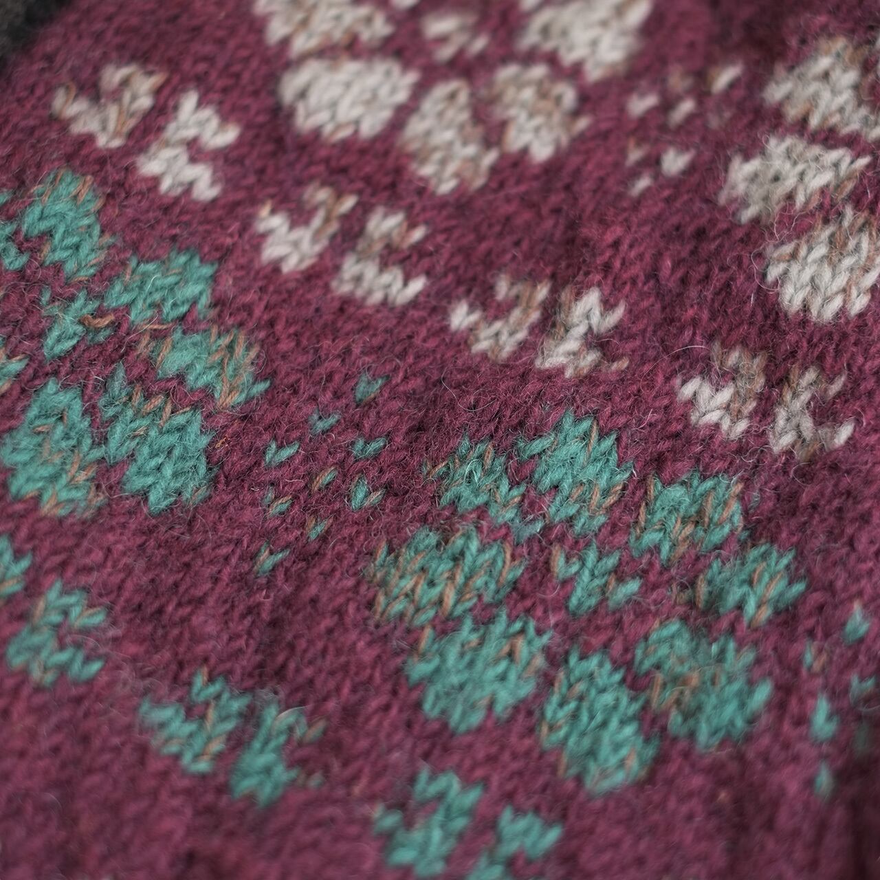 ほんのりワイルドな風合いが珍しく、編み地の柄に負けない存在感があります。