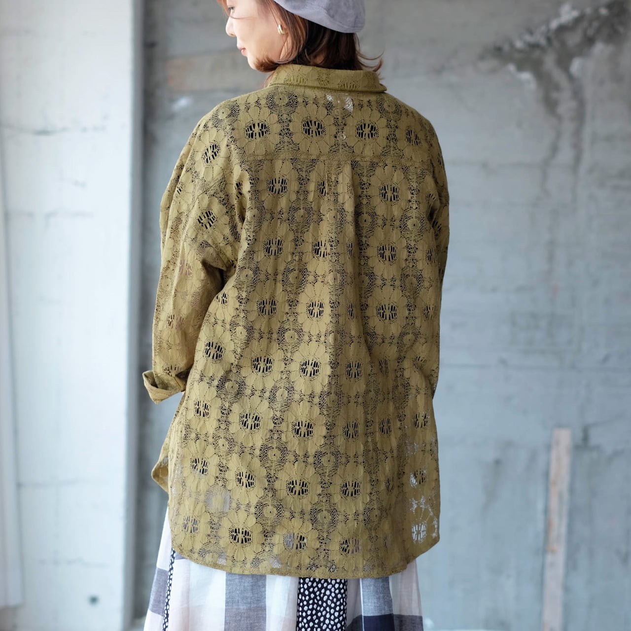 【再販】透け感を楽しむ♪カジュアルさんのためのレトロ花柄レースシャツ(24s-05)オリーブ