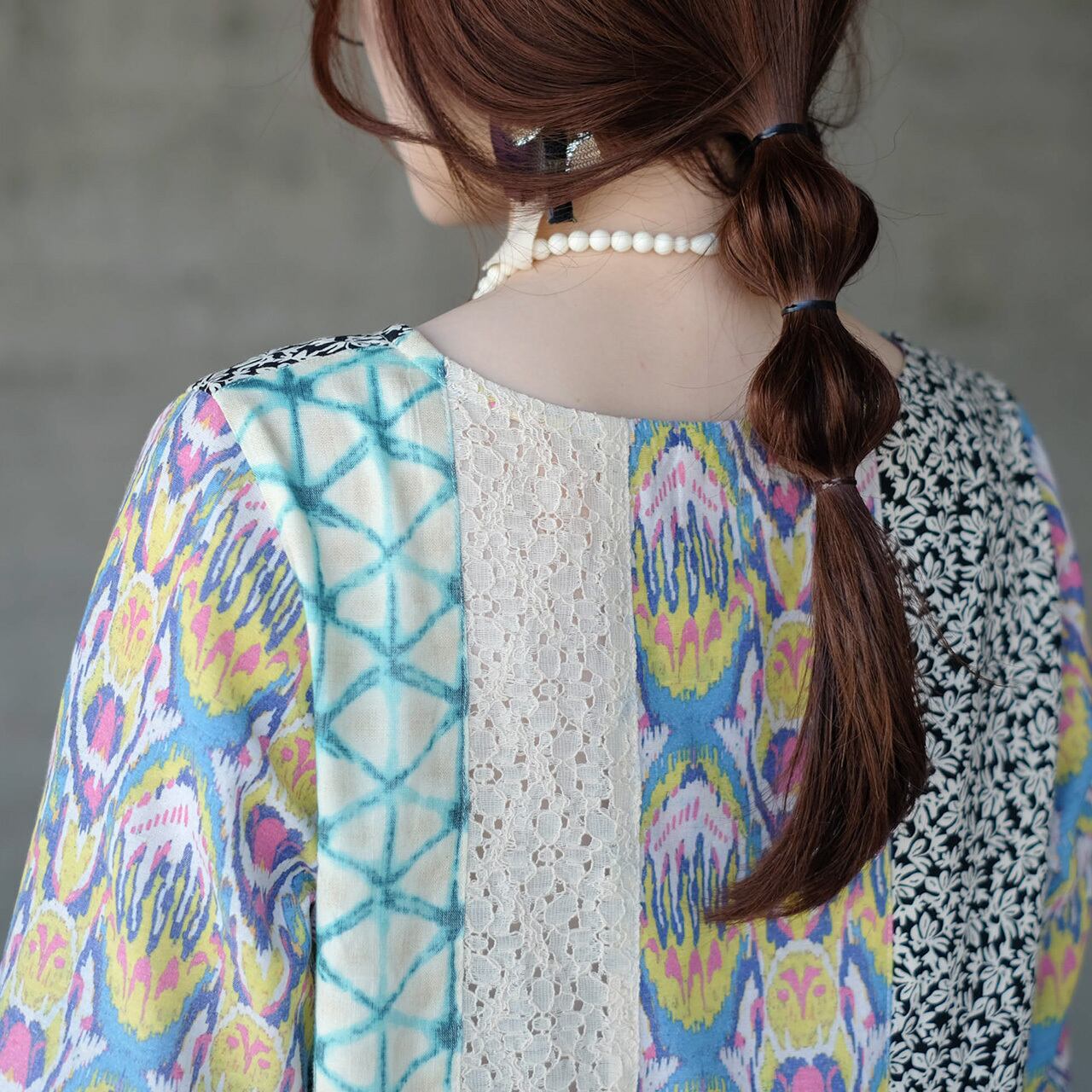 柄生地とレース生地の組み合わせが新鮮なフレアブラウス。