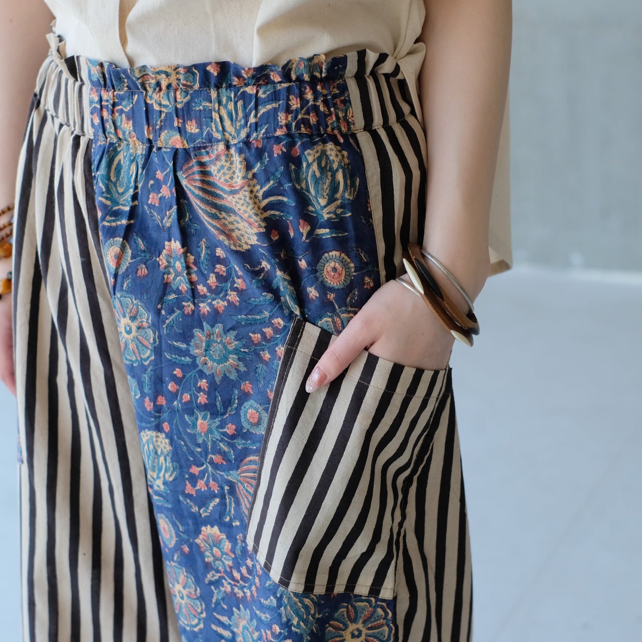 ポケットまで生地違いで仕上げた、こだわりのパッチワークです。