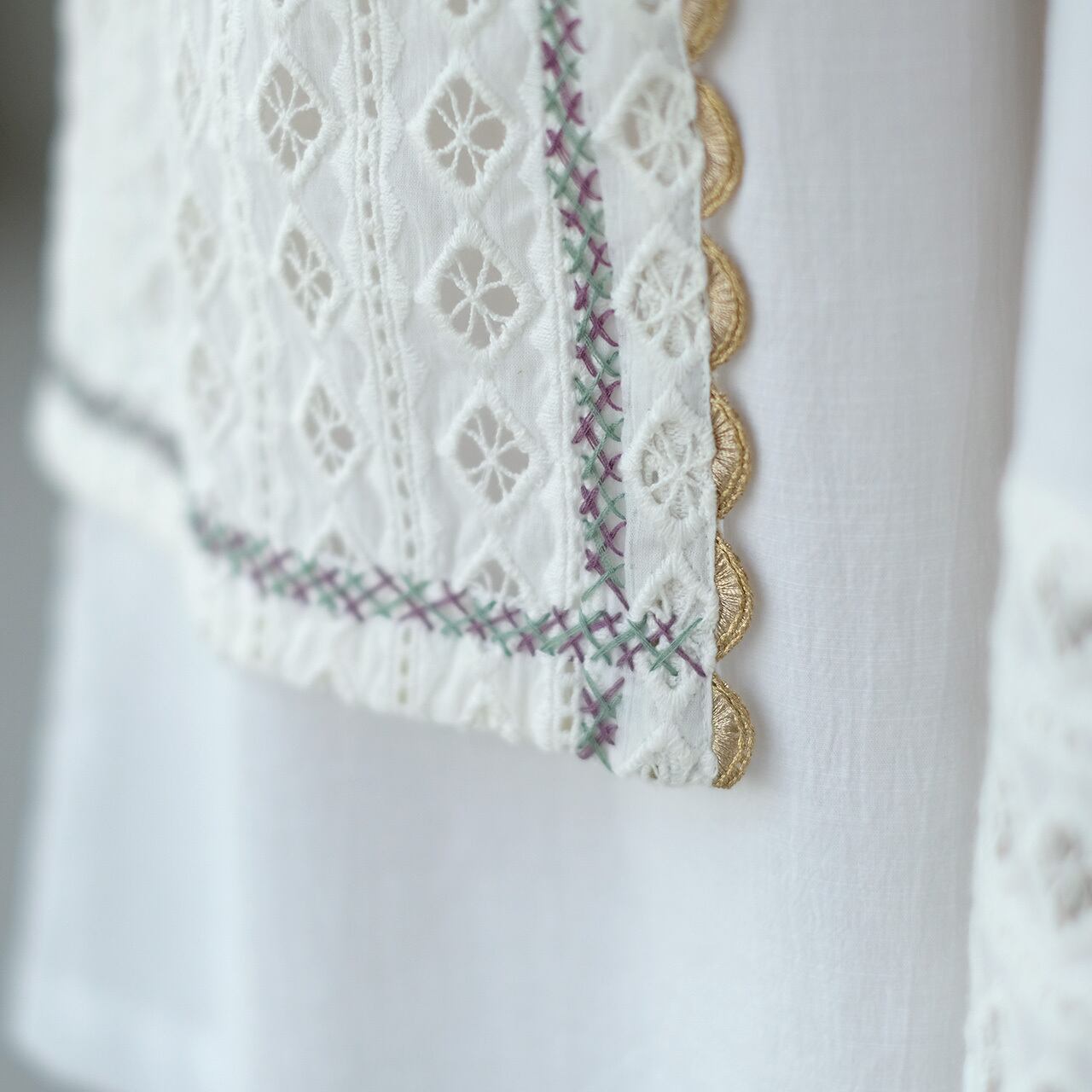 レース生地の端には細かいクロスステッチを手刺繍で施しています。