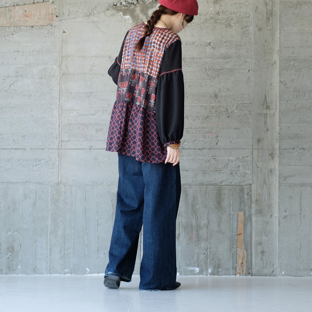 ブロックプリント柄パッチワークティアードチュニック (24w-03)ブラックver2