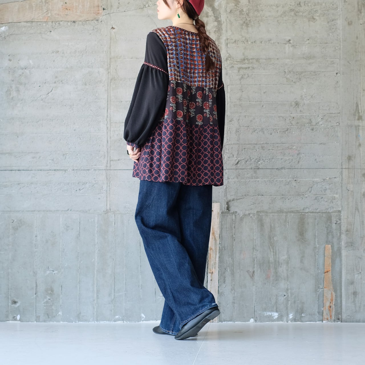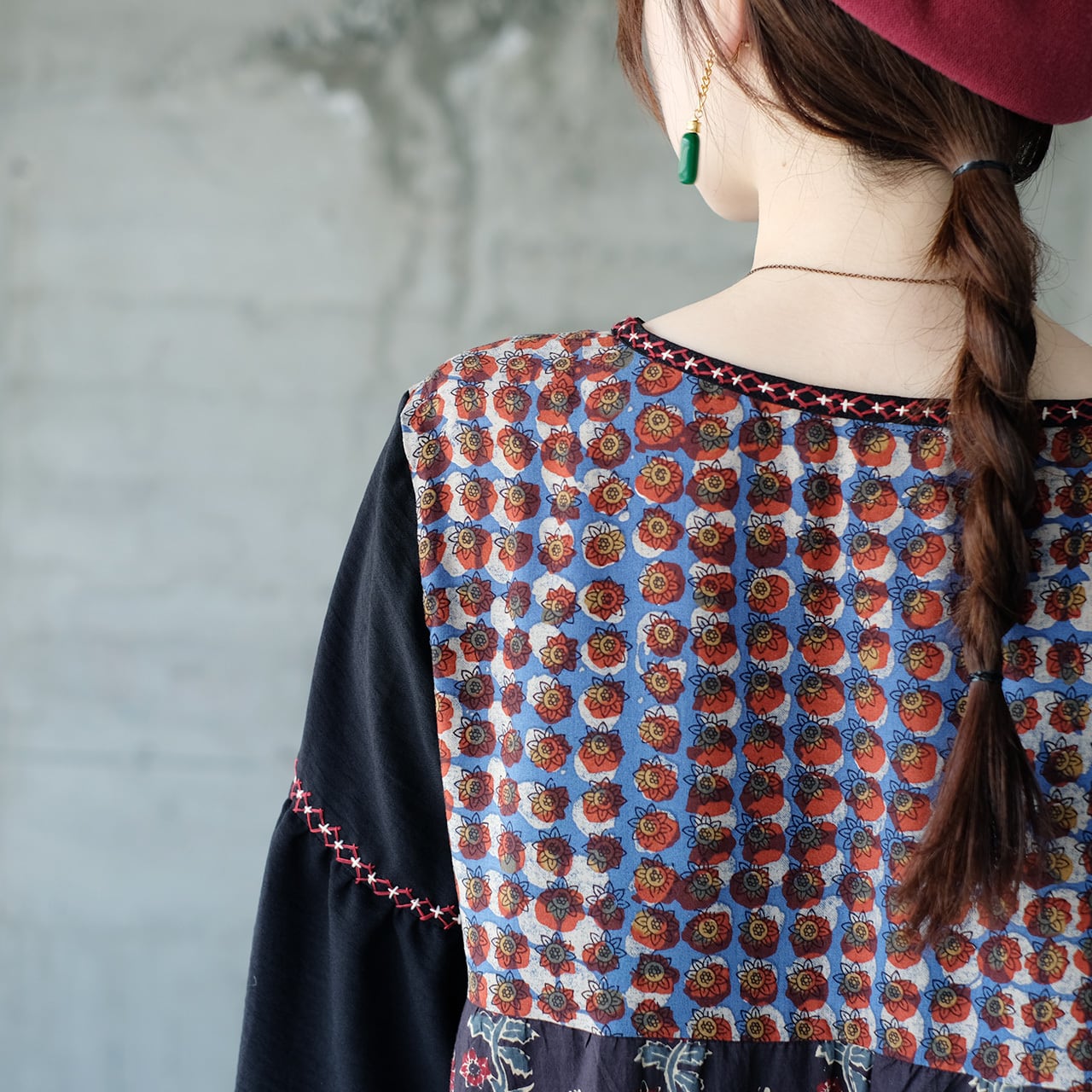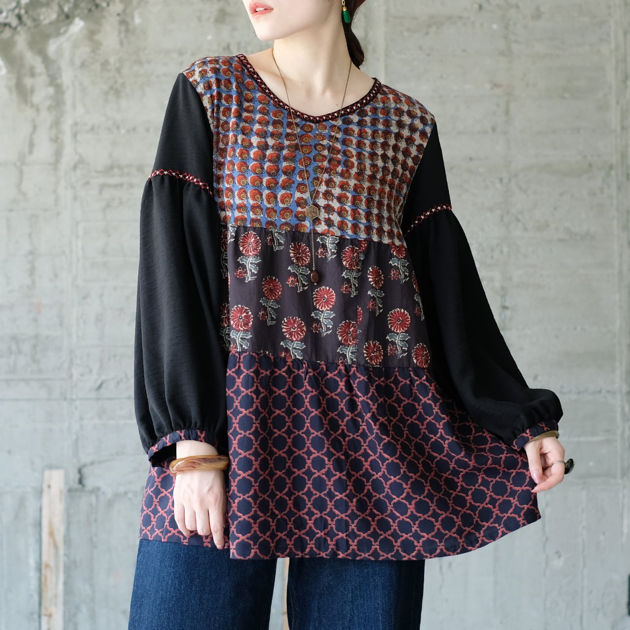【予約販売】ブロックプリント柄パッチワークティアードチュニック (24w-03)ブラック
