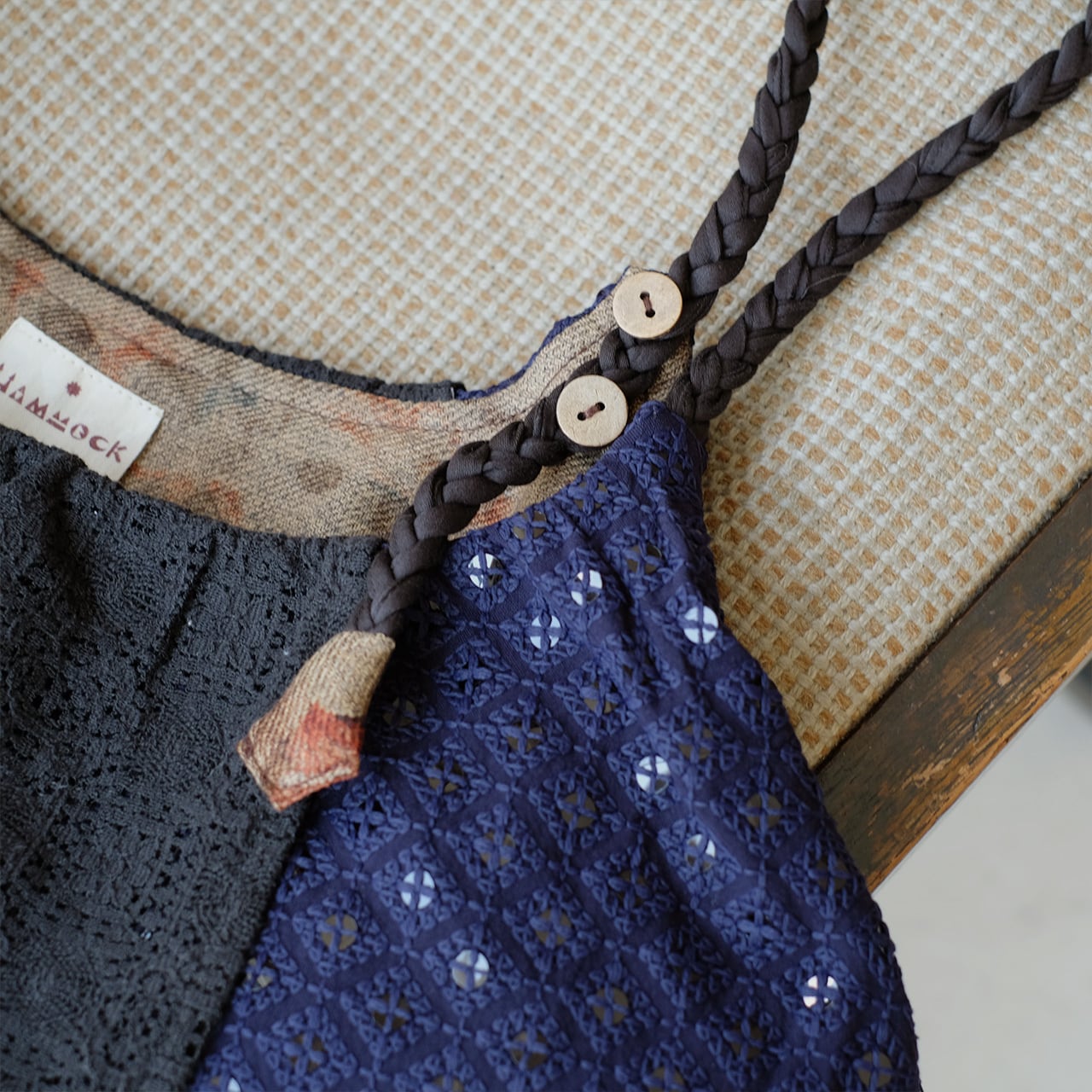 肩紐は三つ編みになっており、ボタンを編み目に通して、好きなところで留めていただけます。