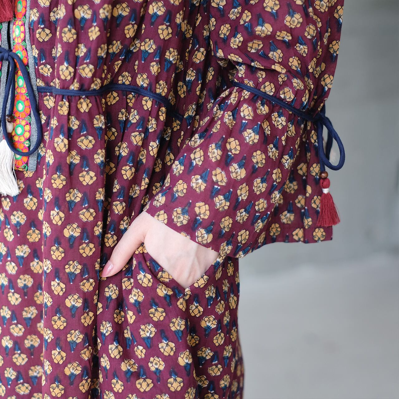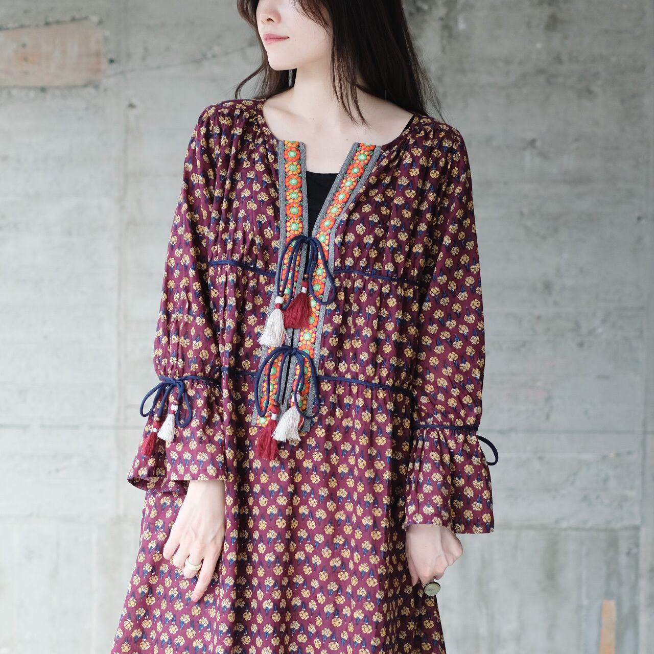 刺繍リボン&タッセルが個性的!ブロックプリント長袖ワンピース(24w-11)ボルドー